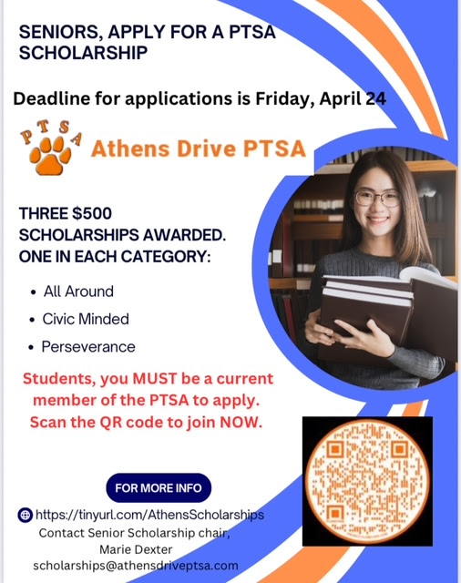 The Athens Drive PTSA offers three $500 scholarships for the following categories: